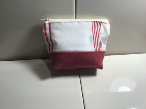 Small size cosmetic bag. Red vertical stripe print at top with co-ordinating plain red cotton fabric for base. Zipper opening at top. 9cm high, 13cm wide at top and 9cm wide at bottom. Great for neatly storing touch up makeup in your handbag eg compact, lipstick and lip gloss. Also great as a coin back or to store sewing supplies. Fully washable.