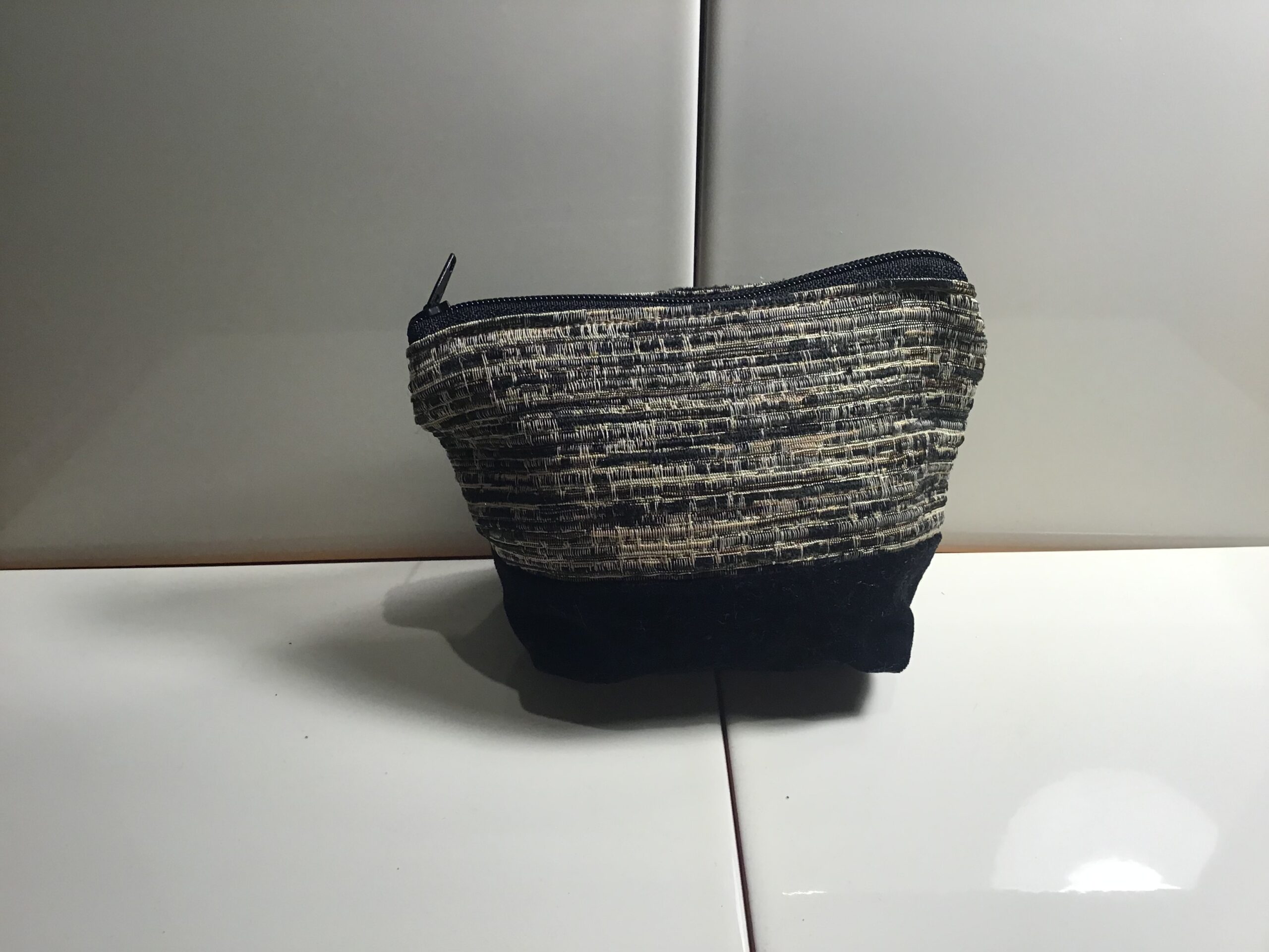 Small size cosmetic bag. Black & gold velour horizontal stripes with shiny thread at top with co-ordinating plain black velvet fabric for base. Zipper opening at top. 9cm high, 13cm wide at top and 9cm wide at bottom. Great for neatly storing touch up makeup in your handbag eg compact, lipstick and lip gloss. Also great as a coin back or to store sewing supplies. Fully washable.
