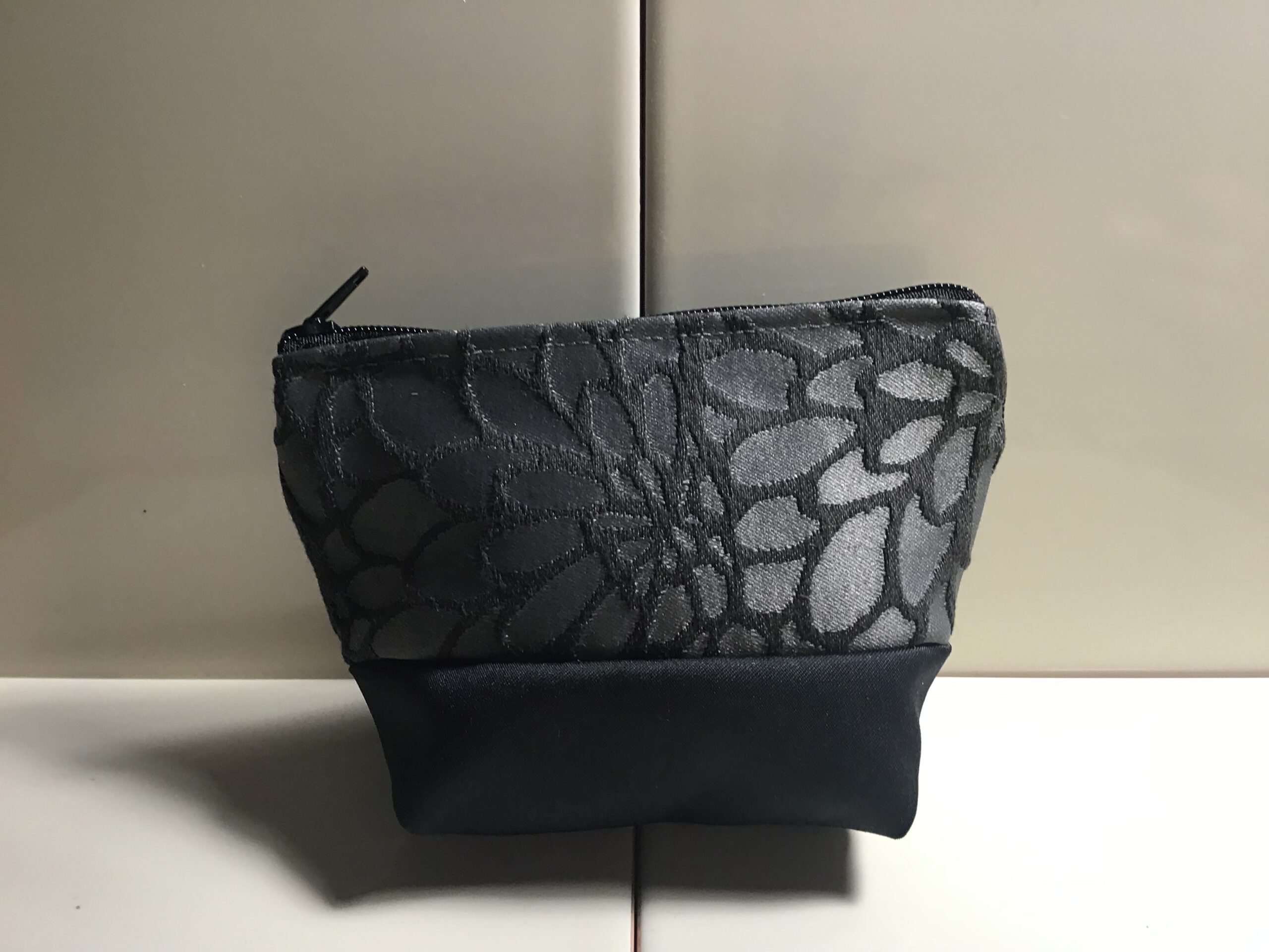 Small size cosmetic bag. Charcoal & silver abstract floral design at top with co-ordinating plain charcoal satin fabric for base. Zipper opening at top. 9cm high, 13cm wide at top and 9cm wide at bottom. Great for neatly storing touch up makeup in your handbag eg compact, lipstick and lip gloss. Also great as a coin back or to store sewing supplies. Fully washable.