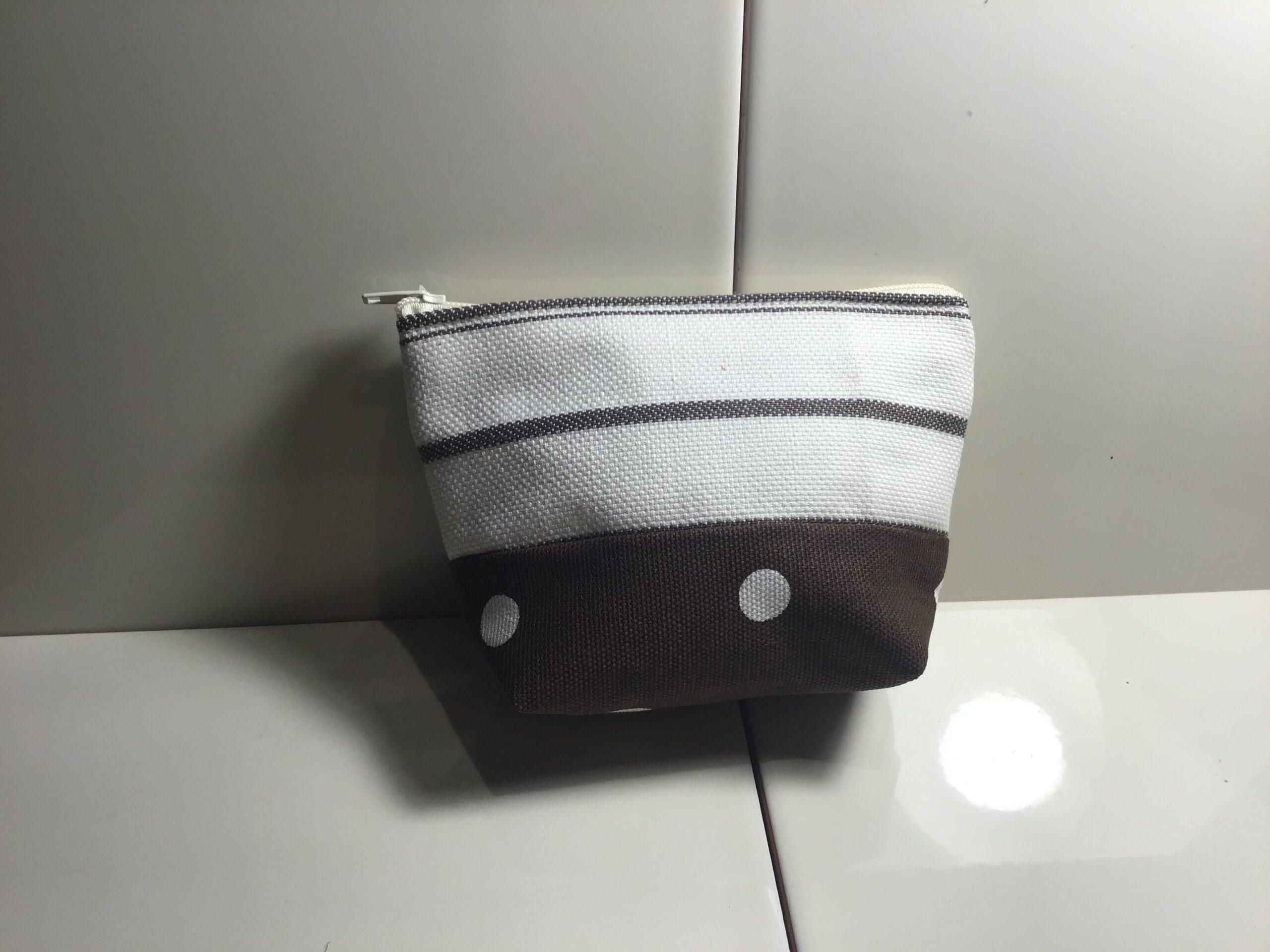 Small size cosmetic bag. Chocolate & white horizontal stripe at top with co-ordinating chocolate & white dot fabric for base. Zipper opening at top. 9cm high, 13cm wide at top and 9cm wide at bottom. Great for neatly storing touch up makeup in your handbag eg compact, lipstick and lip gloss. Also great as a coin back or to store sewing supplies. Fully washable.