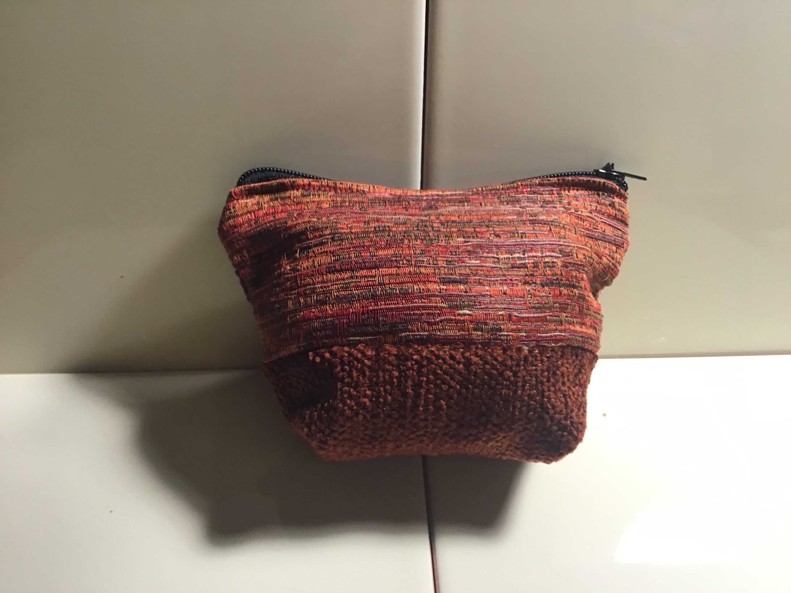 Small size cosmetic bag. Rusty red velour horizontal stripe fabric at top with co-ordinating textured velvet fabric for base. Zipper opening at top. 9cm high, 13cm wide at top and 9cm wide at bottom. Great for neatly storing touch up makeup in your handbag eg compact, lipstick and lip gloss. Also great as a coin back or to store sewing supplies. Fully washable.