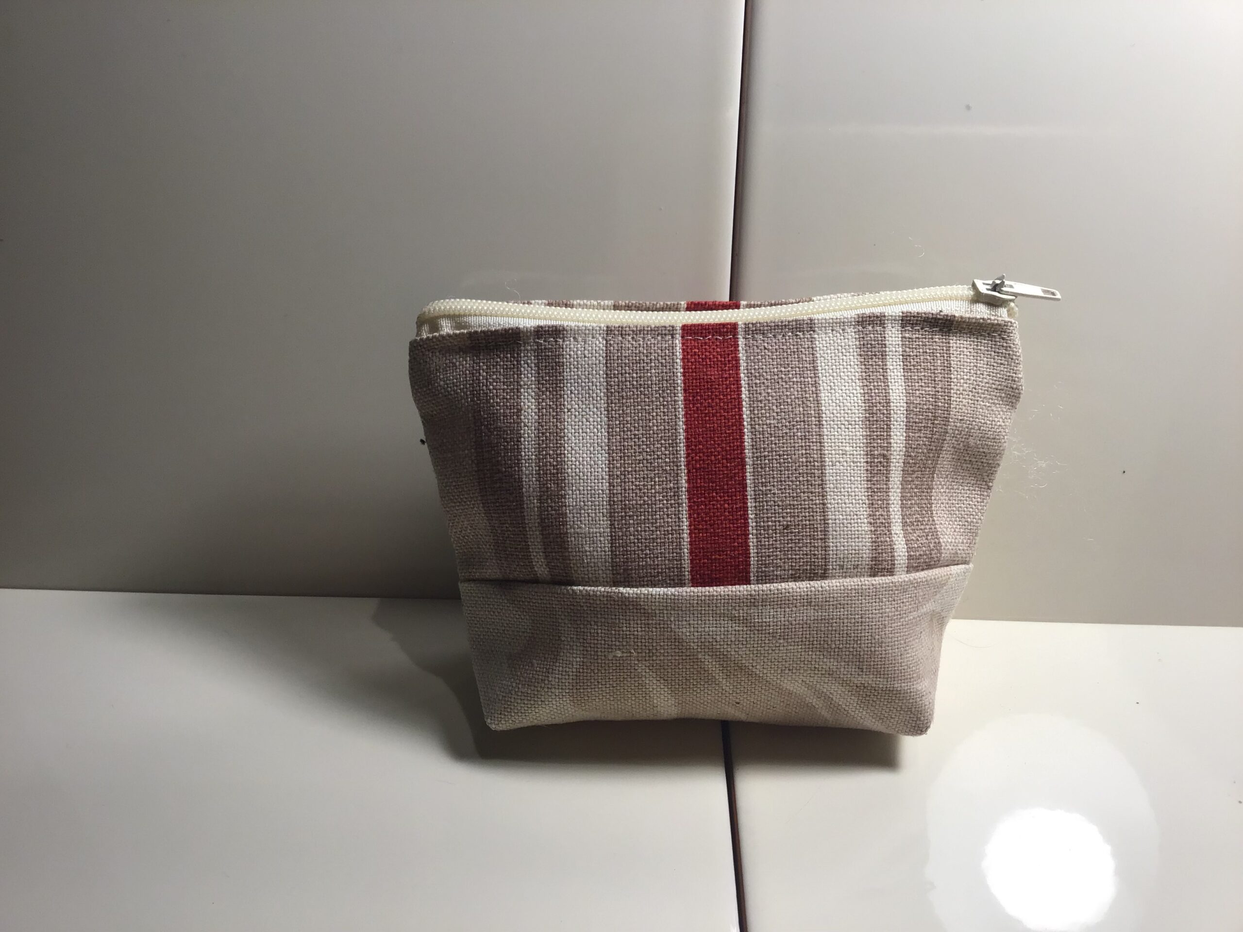 Small size cosmetic bag. Tan, linen & red horizontal stripe fabric at top with co-ordinating tan & linen floral design fabric for base. Zipper opening at top. 9cm high, 13cm wide at top and 9cm wide at bottom. Great for neatly storing touch up makeup in your handbag eg compact, lipstick and lip gloss. Also great as a coin back or to store sewing supplies. Fully washable.