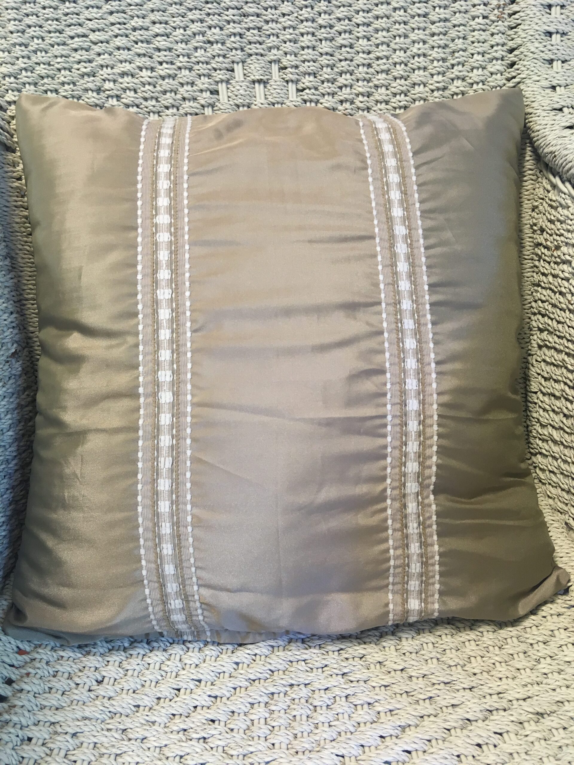 45cm x 45cm scatter cushion cover with zipper opening in bottom seam of cushion. Polyester blend fabric with taupe/pale khaki background & cream & caramel velour vertical stripes.