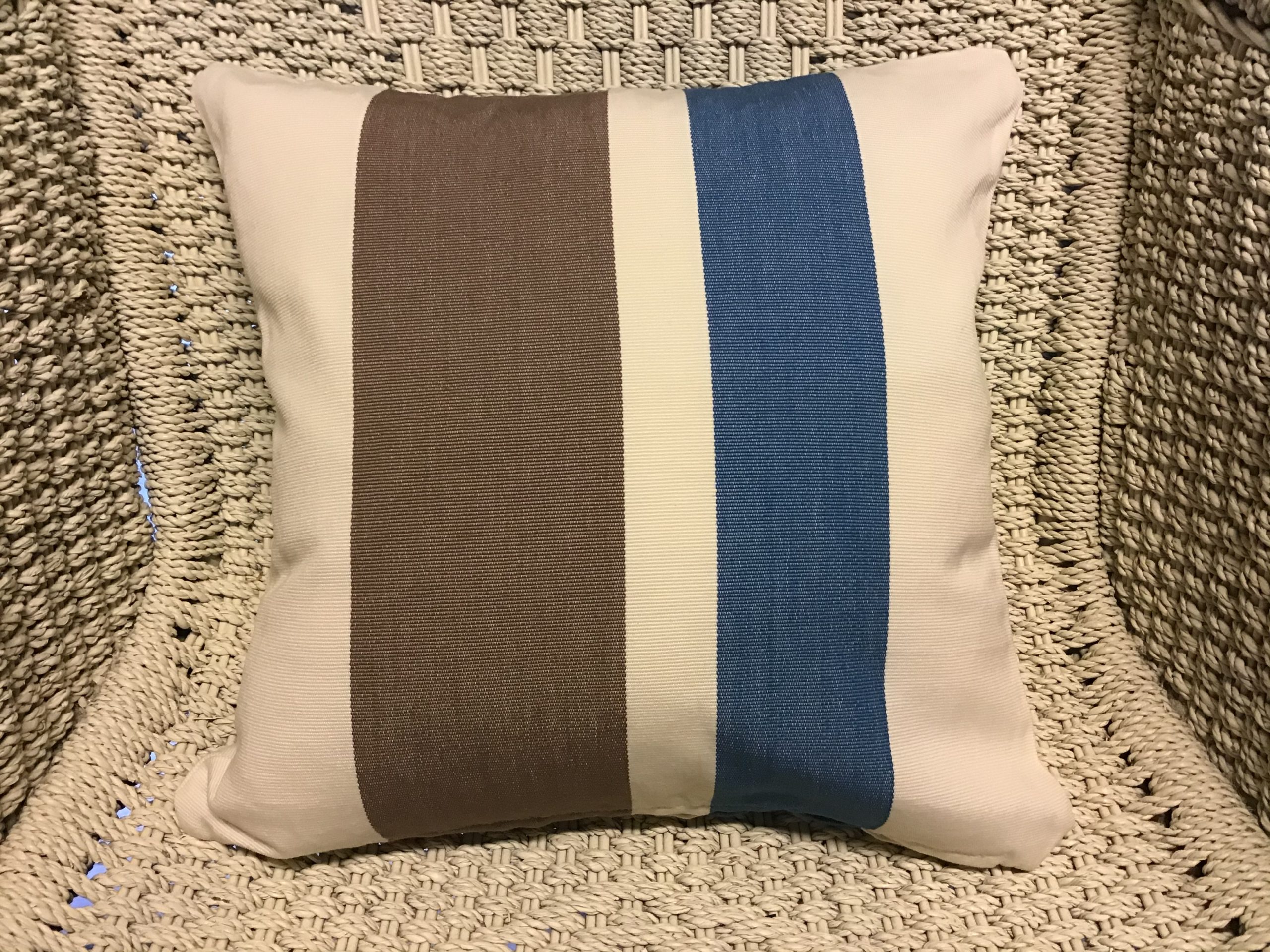35cm x 35cm scatter cushion cover with zipper opening in bottom seam of cushion. Canvas fabric with off white, teal & chocolate vertical stripes.