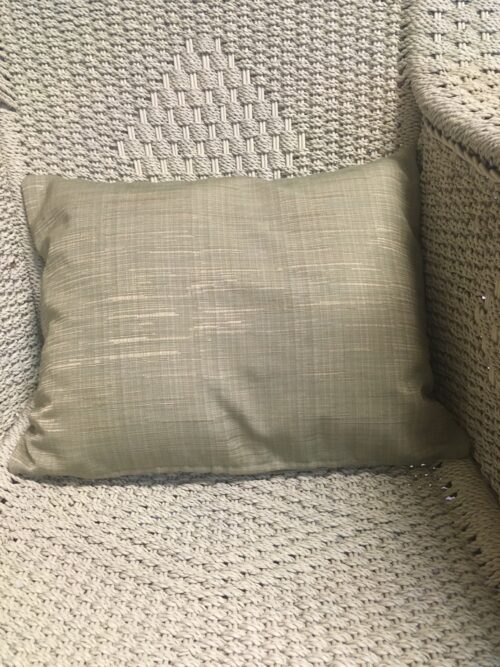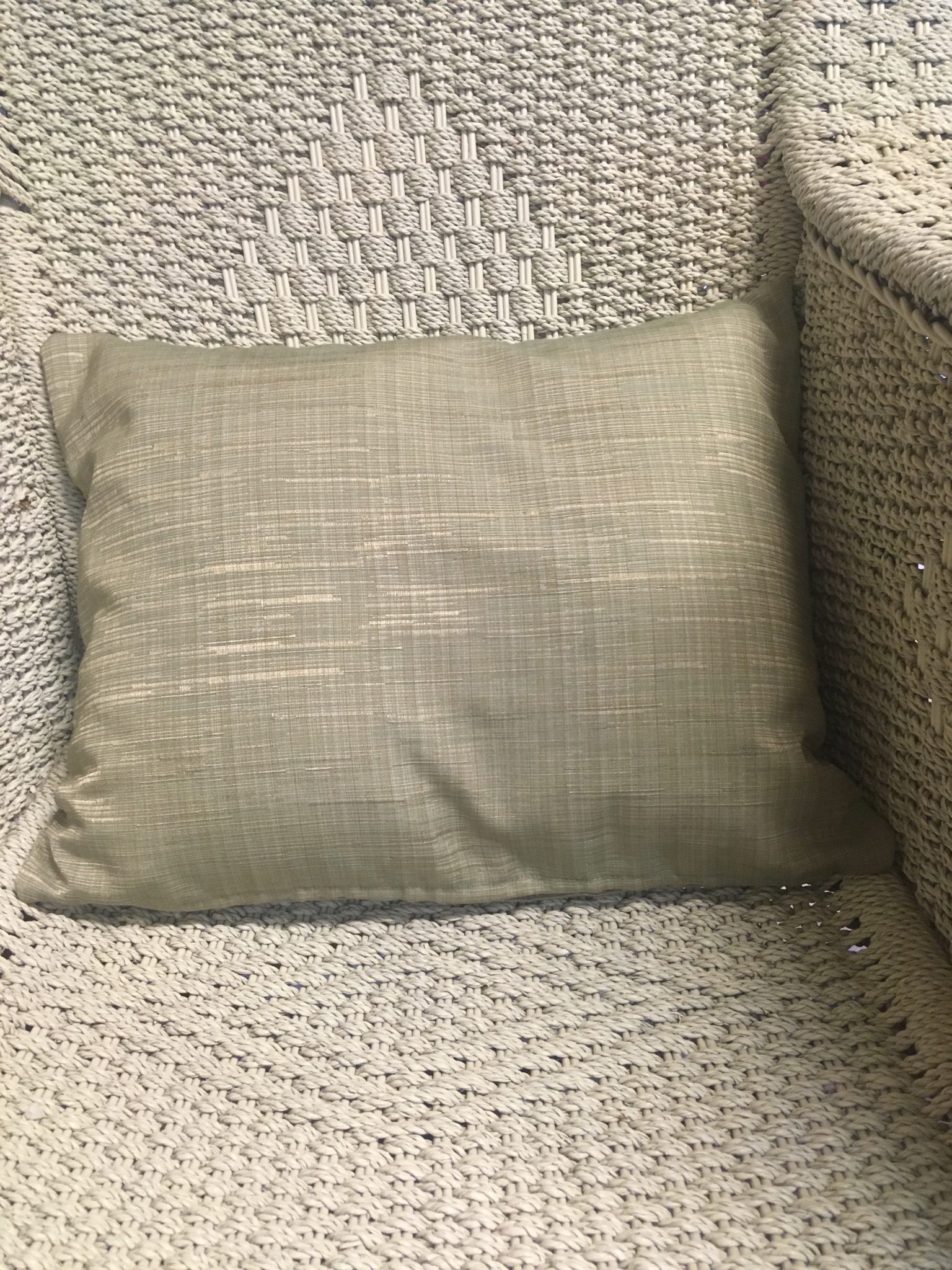 45cm x 35cm scatter cushion cover with zipper opening in bottom seam of cushion. Shiny textured fabric in pale green/gold tones.
