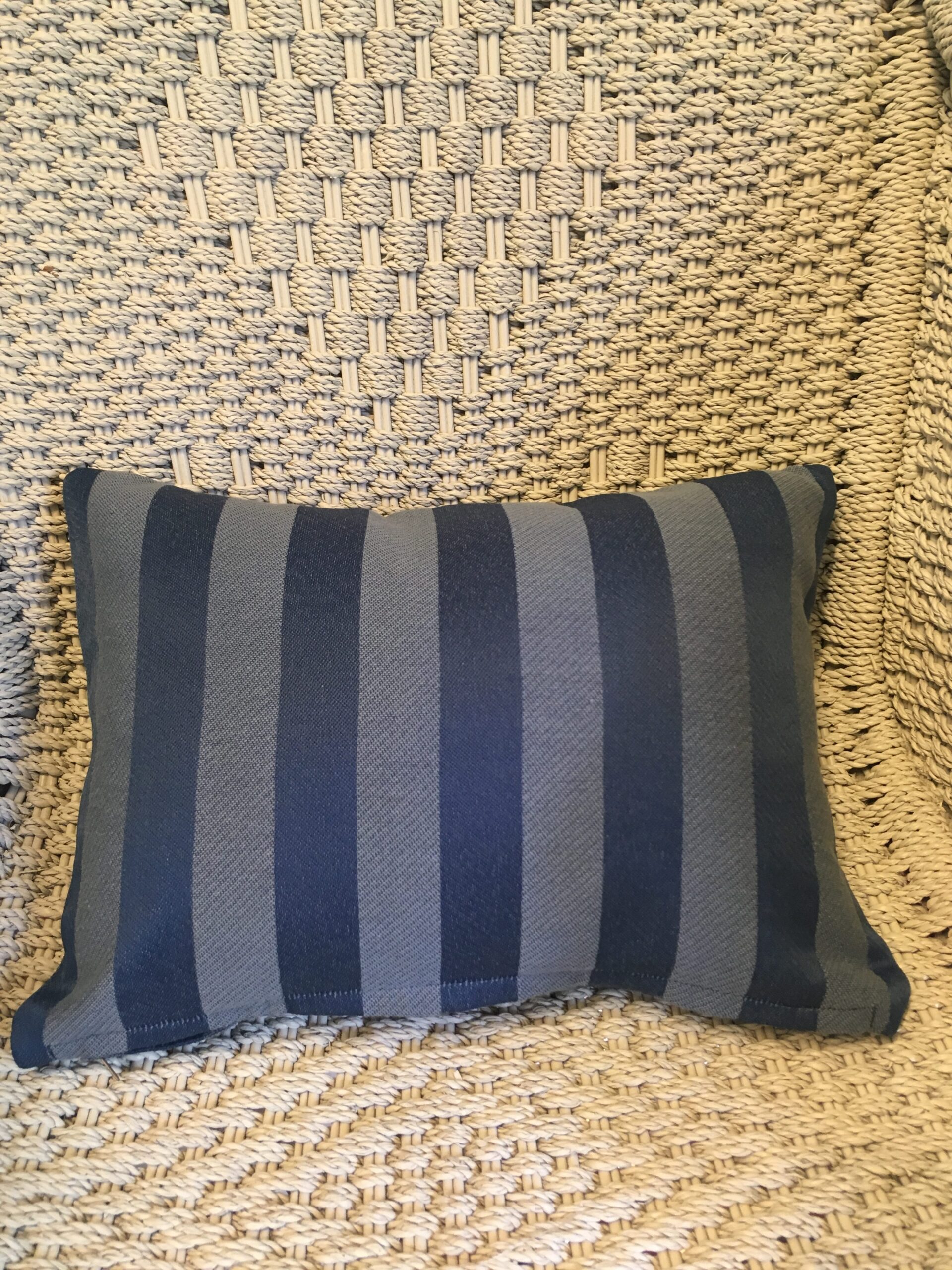 35cm x 25cm scatter cushion cover with zipper opening in bottom seam of cushion. Cotton blend fabric with two tone blue vertical stripes.