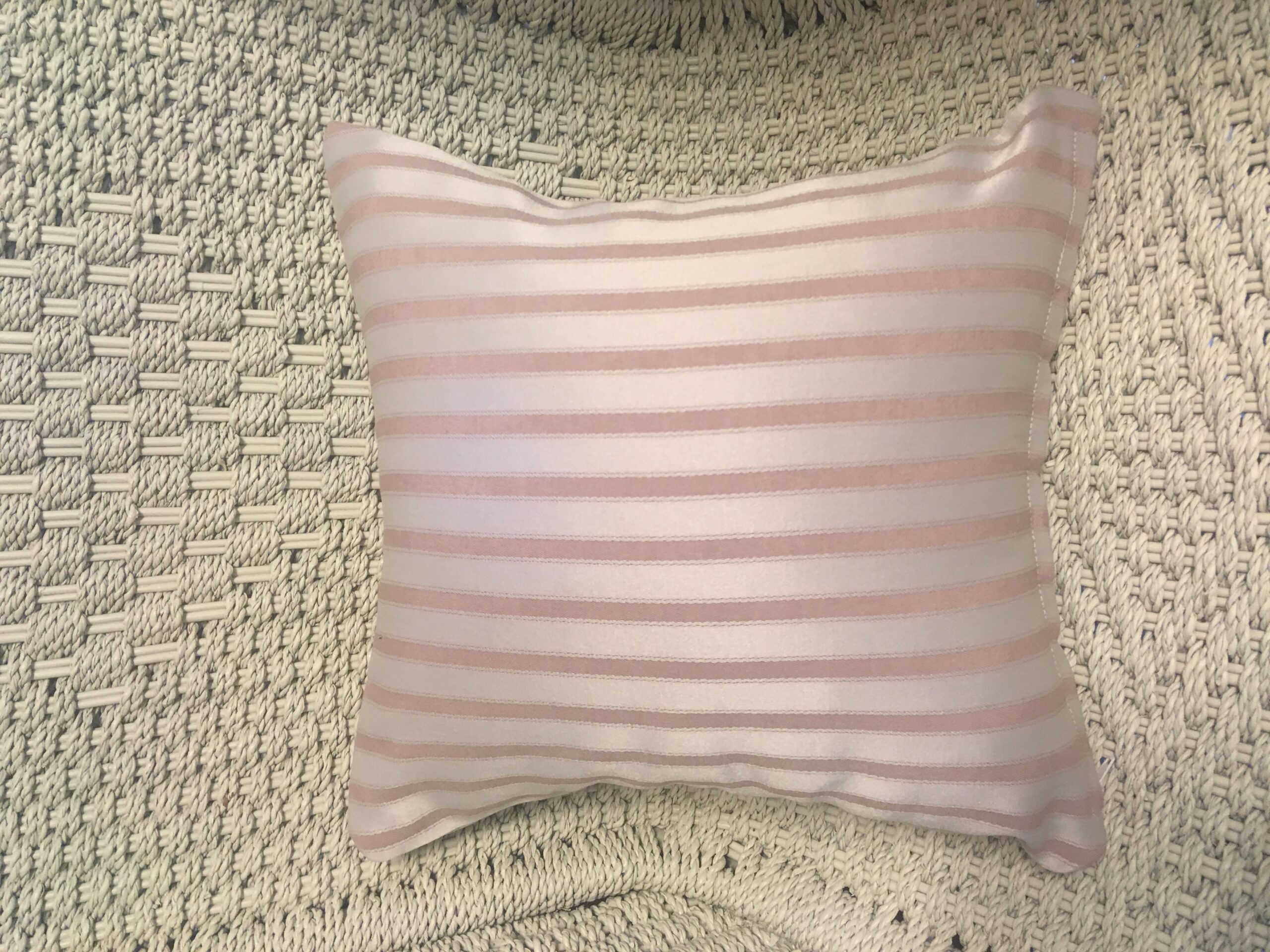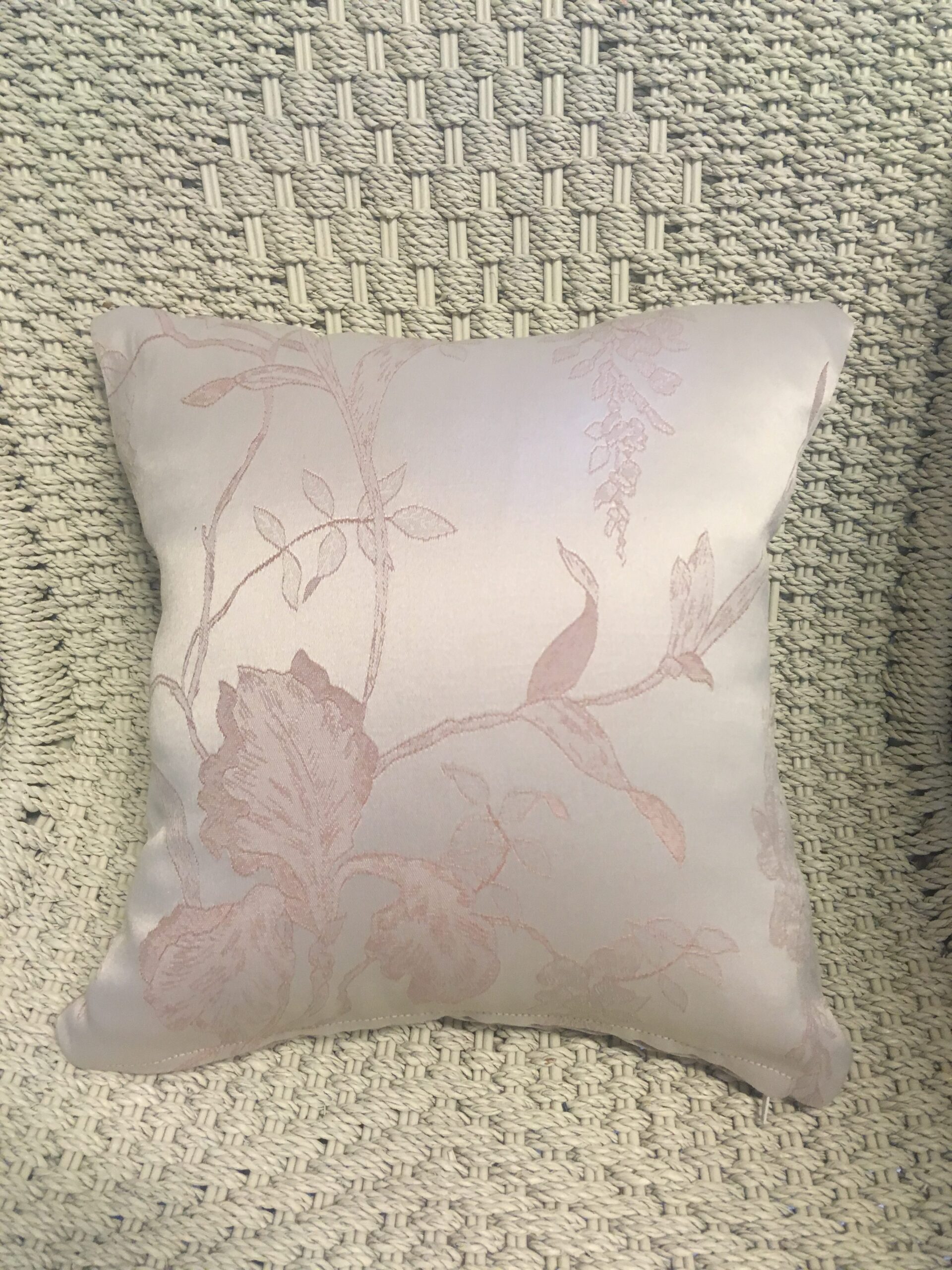 30cm x 30cm scatter cushion cover with zipper opening in bottom seam of cushion. Cotton blend fabric with two tone pale pink floral design on one side of cushion & stripe design on other side of cushion.