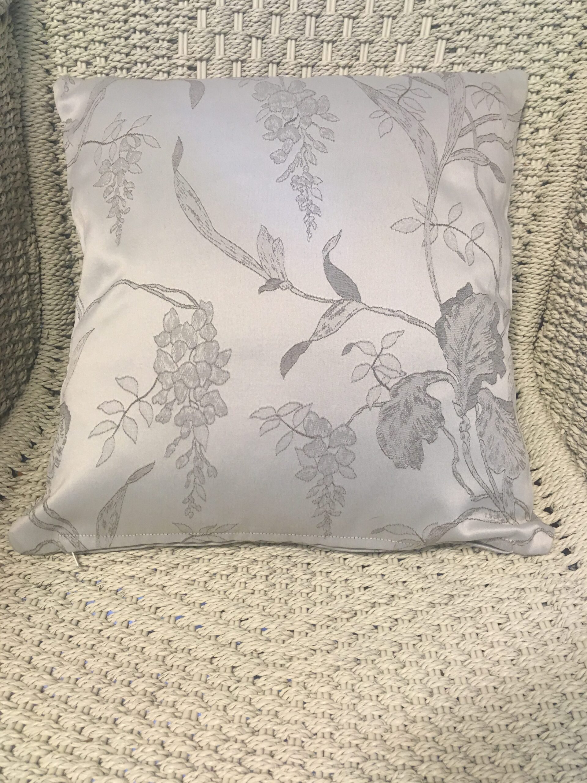 40cm x 40cm scatter cushion cover with zipper opening in bottom seam of cushion. Cotton blend fabric with pale silver background & medium silver floral self print design.