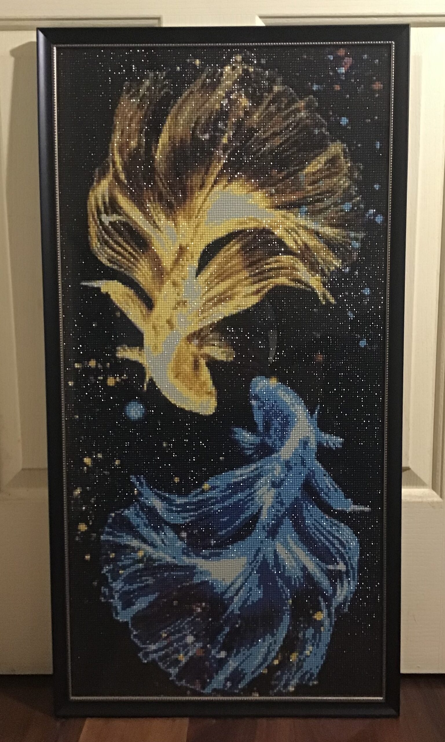 84cm x 44cm diamond painting of 1 x yellow and 1 x blue fish, custom framed in a black gloss frame with light gold beaded inner border. Framed with standard glass.