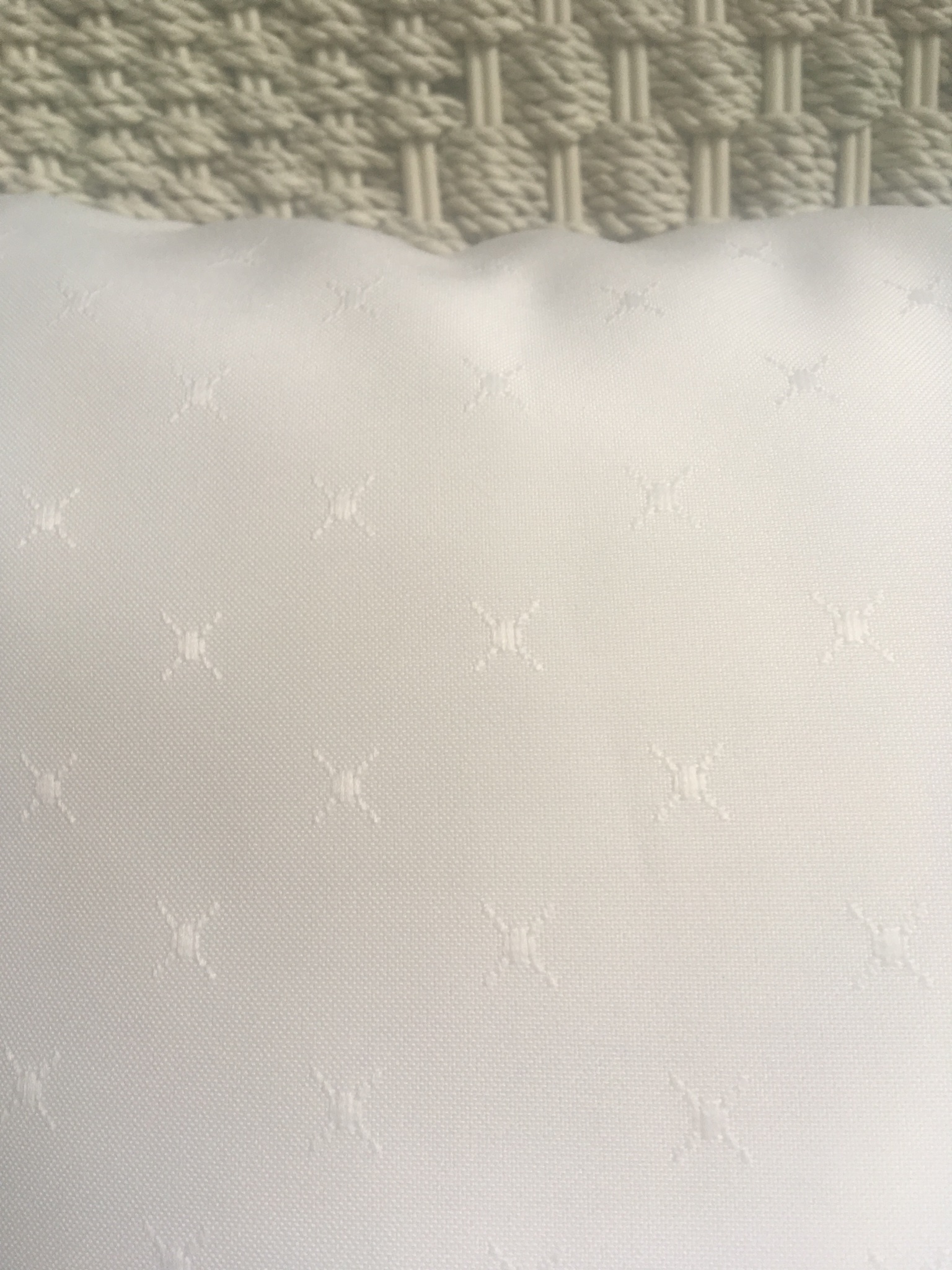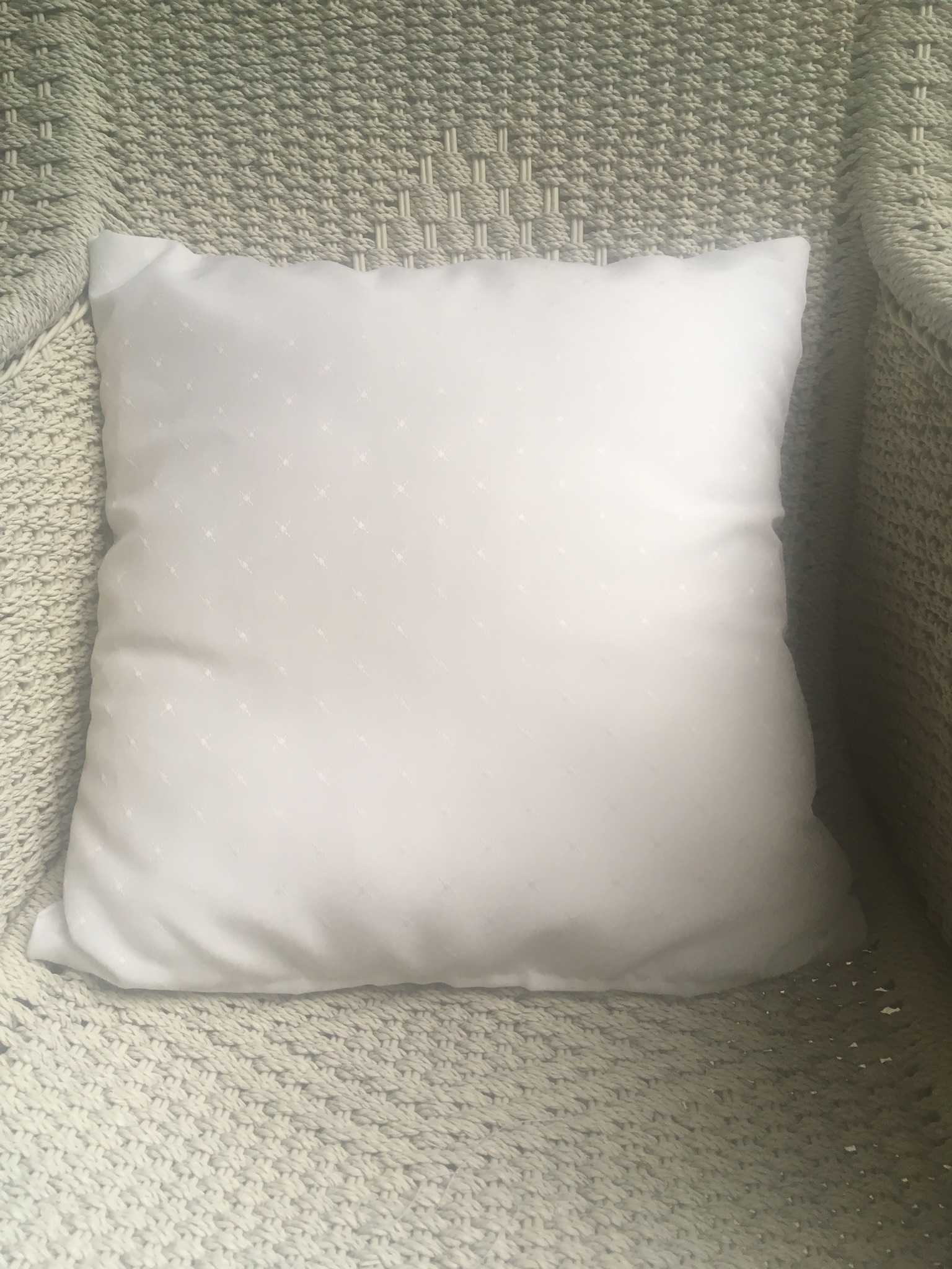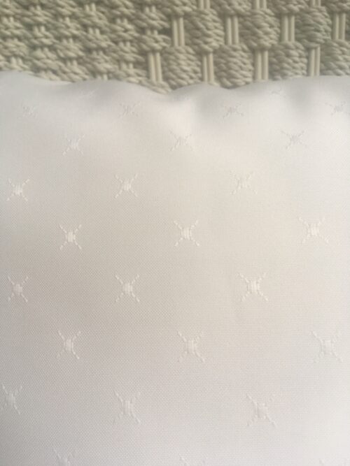 45cm x 45cm scatter cushion cover with zipper opening in bottom seam of cushion. Polyester blend fabric in white with small starburst self print design.