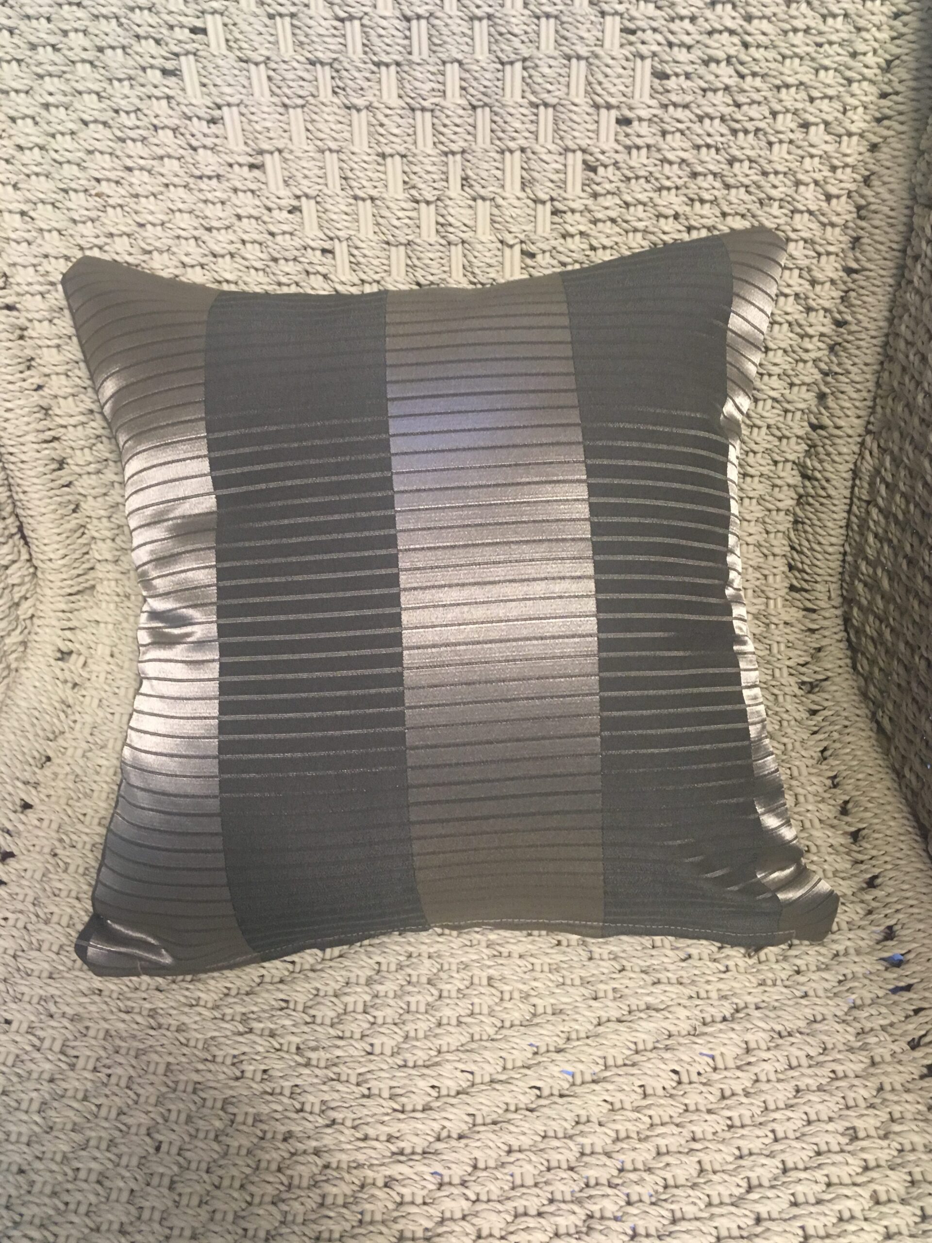 35cm x 35cm scatter cushion cover with zipper opening in bottom seam of cushion. Polyester blend fabric with alternating wide silver and charcoal vertical stripes.